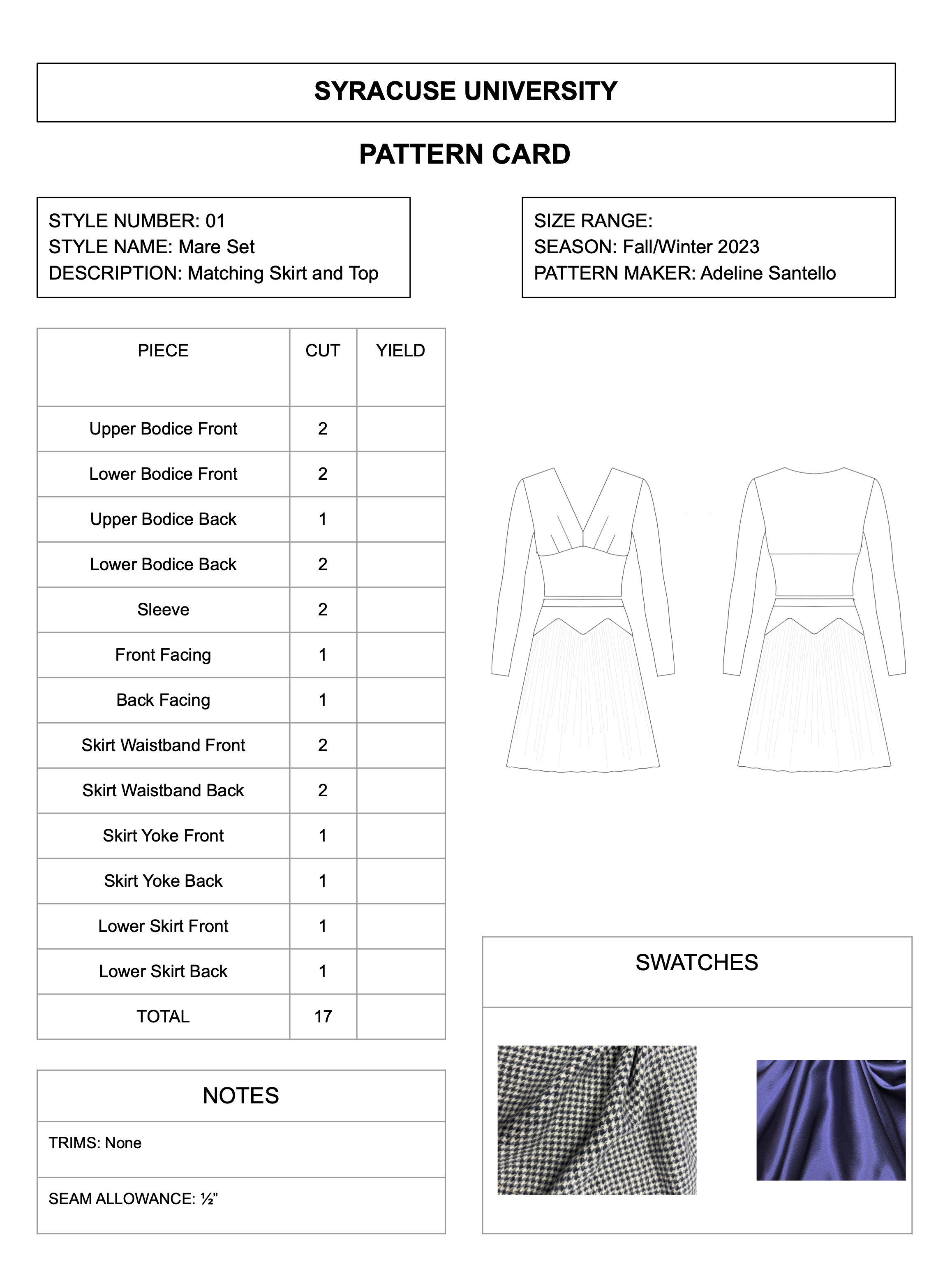 Flat patterning class project. It included researching a customer, designing a top and skirt, doing points of measure, patterning the top and skirt, making a mock up, making a pattern card, and creating a final garment.